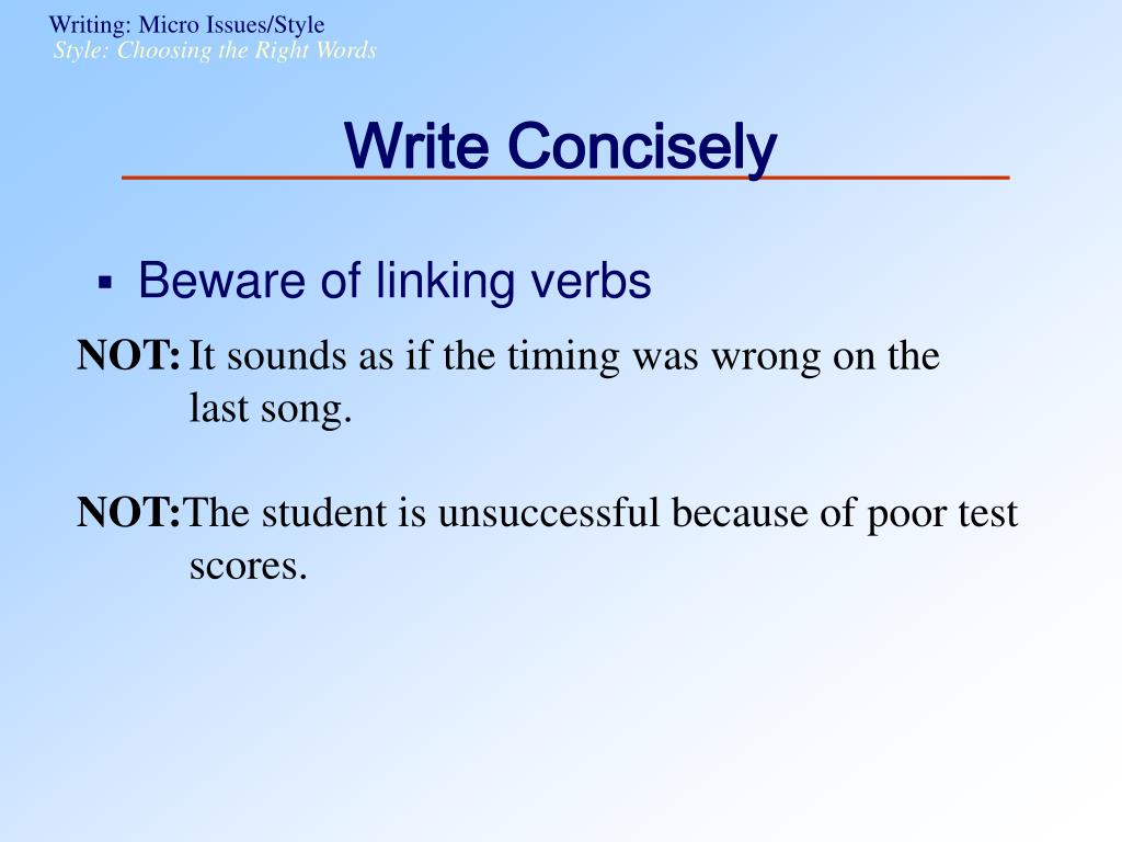 Style: Choosing the Right Words Write Concisely • Beware of linking verbs NOT: It sounds as if the timing was wrong on the last song. NOT:The student is unsuccessful because of poor test scores.