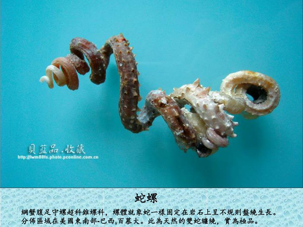 蛇螺 綱蟹腹足守螺超科錐螺科,螺體就象蛇一樣固定在岩石上呈不規則盤繞生長。分佈區域在美國東南部-巴西,百慕大。此為天然的雙蛇纏繞,實為極品。