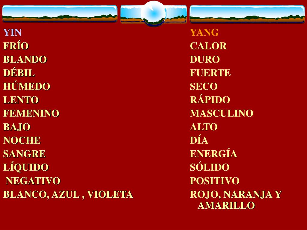 YIN FRÍO BLANDO DÉBIL HÚMEDO LENTO FEMENINO BAJO NOCHE SANGRE LÍQUIDO NEGATIVO BLANCO, AZUL , VIOLETA YANG CALOR DURO FUERTE SECO RÁPIDO MASCULINO ALTO DÍA ENERGÍA SÓLIDO POSITIVO ROJO, NARANJA Y AMARILLO