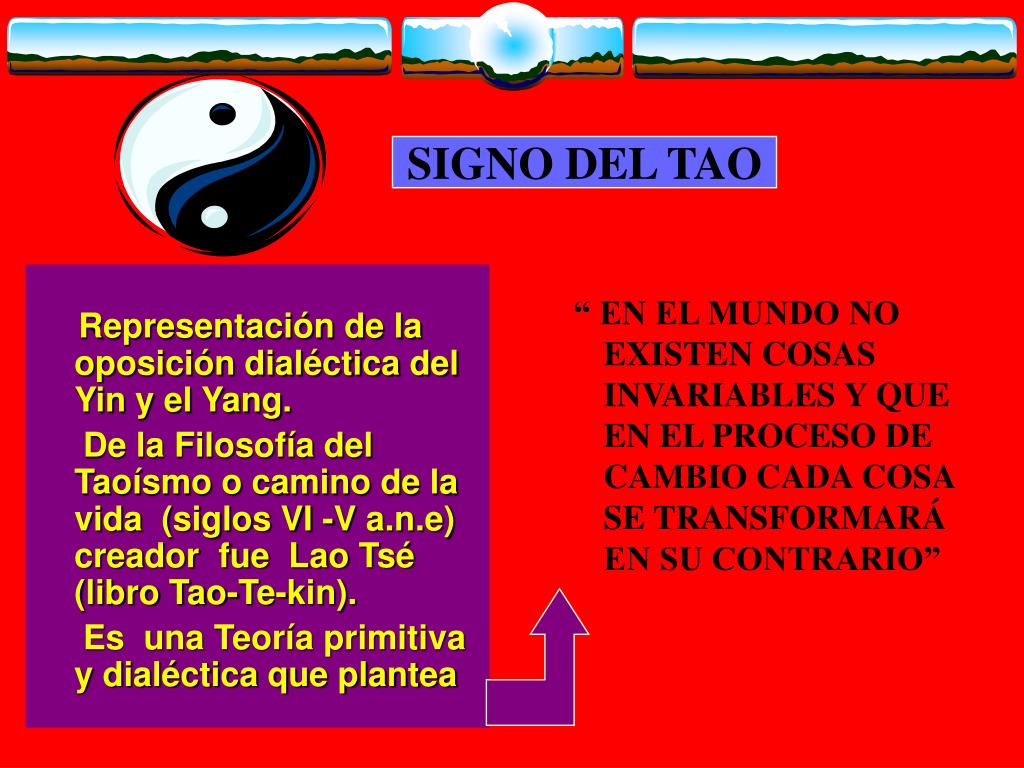 Representación de la oposición dialéctica del Yin y el Yang. De la Filosofía del Taoísmo o camino de la vida (siglos VI -V a.n.e) creador fue Lao Tsé (libro Tao-Te-kin). Es una Teoría primitiva y dialéctica que plantea “ EN EL MUNDO NO EXISTEN COSAS INVARIABLES Y QUE EN EL PROCESO DE CAMBIO CADA COSA SE TRANSFORMARÁ EN SU CONTRARIO” SIGNO DEL TAO