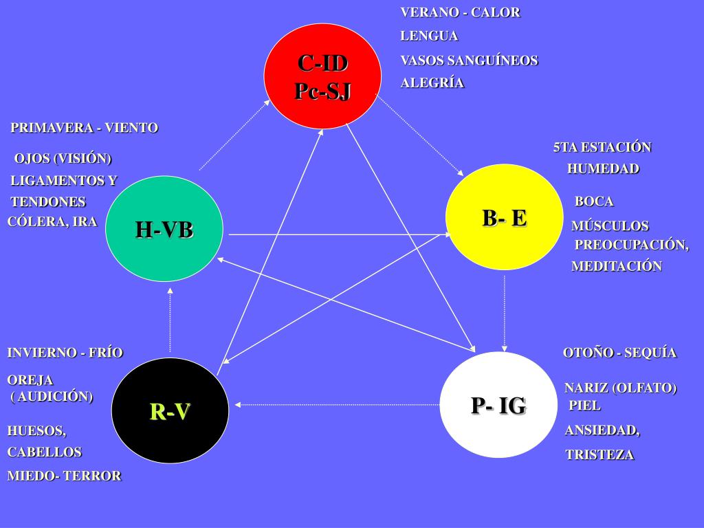 VERANO - CALOR C-ID Pc-SJ LENGUA VASOS SANGUÍNEOS ALEGRÍA PRIMAVERA - VIENTO 5TA ESTACIÓN HUMEDAD OJOS (VISIÓN) B- E BOCA MÚSCULOS LIGAMENTOS Y TENDONES H-VB CÓLERA, IRA PREOCUPACIÓN, MEDITACIÓN INVIERNO - FRÍO OTOÑO- SEQUÍA P- IG R-V OREJA ( AUDICIÓN) NARIZ (OLFATO) PIEL ANSIEDAD, TRISTEZA HUESOS, CABELLOS MIEDO- TERROR