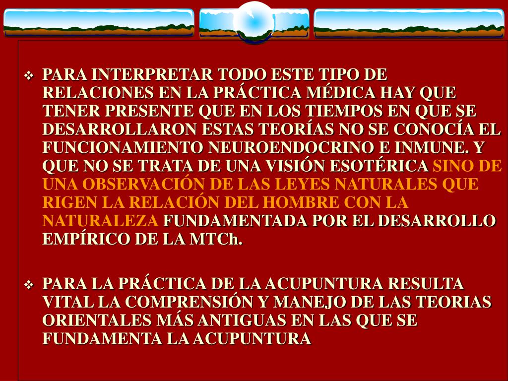 PARA INTERPRETAR TODO ESTE TIPO DE RELACIONES EN LA PRÁCTICA MÉDICA HAY QUE TENER PRESENTE QUE EN LOS TIEMPOS EN QUE SE DESARROLLARON ESTAS TEORÍAS NO SE CONOCÍA EL FUNCIONAMIENTO NEUROENDOCRINO E INMUNE. Y QUE NO SE TRATA DE UNA VISIÓN ESOTÉRICA SINO DE UNA OBSERVACIÓN DE LAS LEYES NATURALES QUE RIGEN LA RELACIÓN DEL HOMBRE CON LA NATURALEZA FUNDAMENTADA POR EL DESARROLLO EMPÍRICO DE LA MTCh. PARA LA PRÁCTICA DE LA ACUPUNTURA RESULTA VITAL LA COMPRENSIÓN Y MANEJO DE LAS TEORIAS ORIENTALES MÁS ANTIGUAS EN LAS QUE SE FUNDAMENTA LA ACUPUNTURA