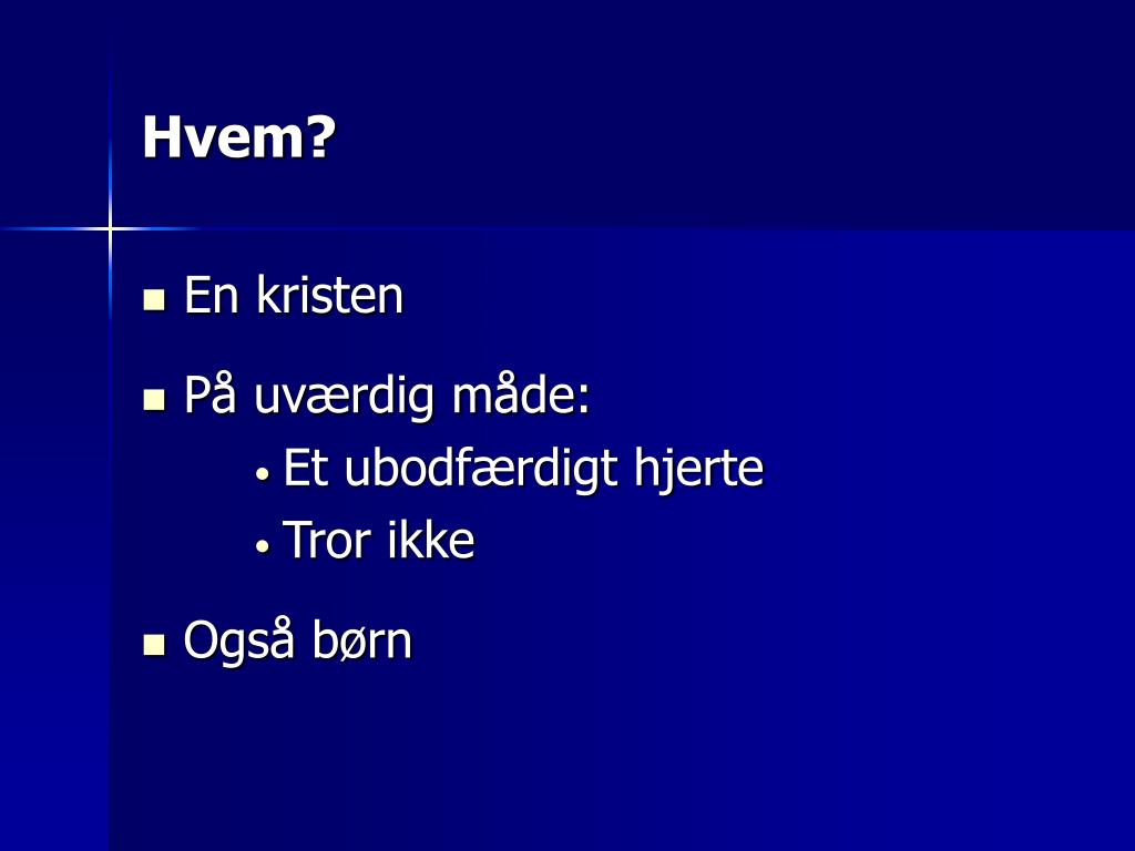 Hvem? • En kristen • På uværdig måde: • Et ubodfærdigt hjerte • Tror ikke • Også børn