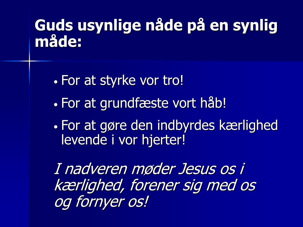 Guds usynlige nåde på en synlig måde: • For at styrke vor tro! • For at grundfæste vort håb! • For at gøre den indbyrdes kærlighed levende i vor hjerter! I nadveren møder Jesus os i kærlighed, forener sig med os og fornyer os!