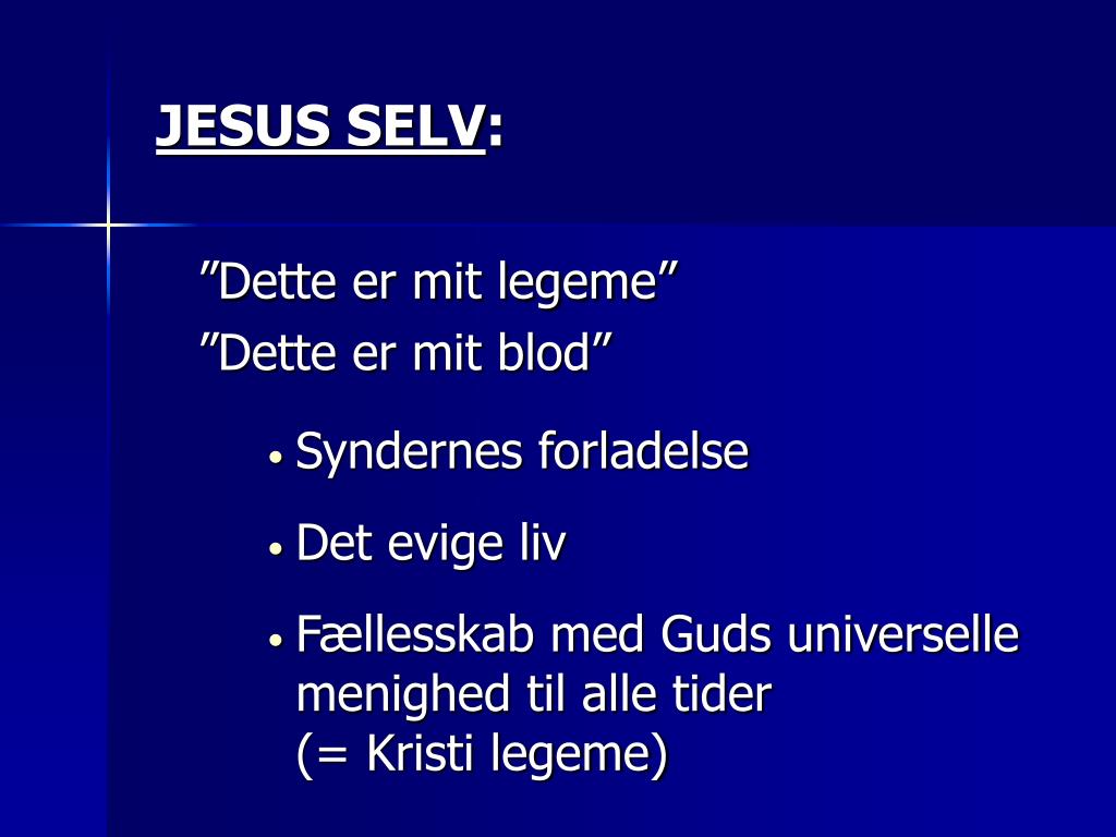 JESUS SELV: ”Dette er mit legeme” ”Dette er mit blod” • Syndernes forladelse • Det evige liv • Fællesskab med Guds universelle menighed til alle tider (= Kristi legeme)