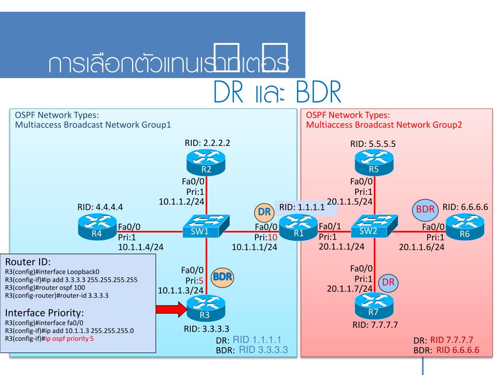 BDR DR R1 R4 BDR DR R3 RID 1.1.1.1 RID 7.7.7.7 RID 3.3.3.3 RID 6.6.6.6 การเลือกตัวแทนเราท์เตอร์ DR และ BDR OSPF Network Types:Multiaccess Broadcast Network Group1 OSPF Network Types:Multiaccess Broadcast Network Group2 RID: 2.2.2.2 RID: 5.5.5.5 R5 R2 Fa0/0 Pri:1 10.1.1.2/24 Fa0/0 Pri:1 20.1.1.5/24 RID: 6.6.6.6 RID: 4.4.4.4 RID: 1.1.1.1 Fa0/1 Pri:1 20.1.1.1/24 Fa0/0 Pri:1 10.1.1.4/24 Fa0/0 Pri:10 10.1.1.1/24 Fa0/0 Pri:1 20.1.1.6/24 SW2 SW1 R6 Router ID: R3(config)#interface Loopback0 R3(config-if)#ip add 3.3.3.3 255.255.255.255 R3(config)#router ospf 100 R3(config-router)#router-id 3.3.3.3 Interface Priority: R3(config)#interface fa0/0 R3(config-if)#ip add 10.1.1.3 255.255.255.0 R3(config-if)#ipospf priority 5 Fa0/0 Pri:1 20.1.1.7/24 Fa0/0 Pri:5 10.1.1.3/24 R7 RID: 7.7.7.7 RID: 3.3.3.3 11-13 DR: BDR: DR: BDR: