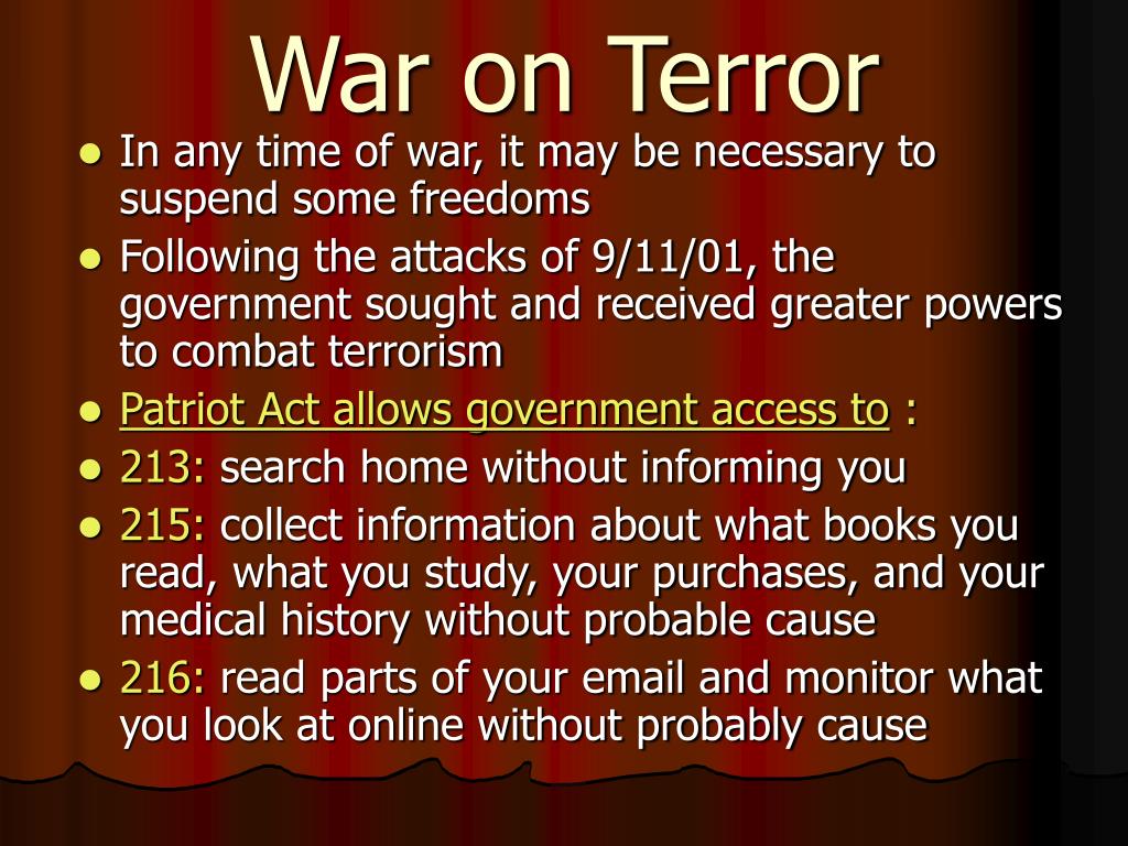War on Terror • In any time of war, it may be necessary to suspend some freedoms • Following the attacks of 9/11/01, the government sought and received greater powers to combat terrorism • Patriot Act allows government access to : • 213: search home without informing you • 215: collect information about what books you read, what you study, your purchases, and your medical history without probable cause • 216: read parts of your email and monitor what you look at online without probably cause