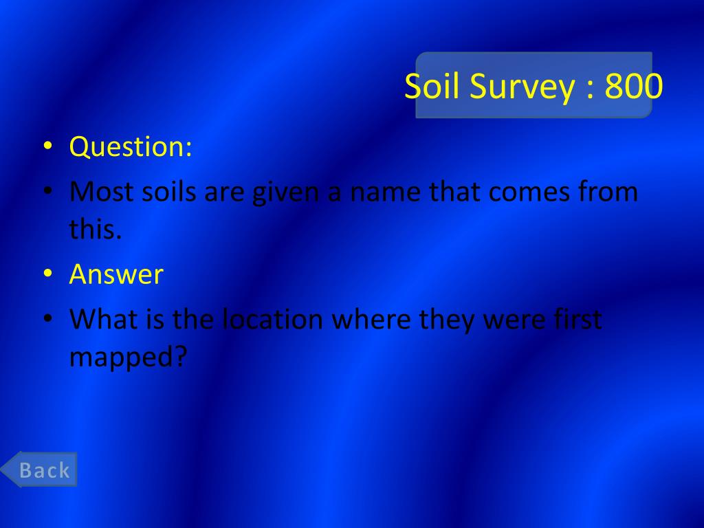 Soil Survey : 800 • Question: • Most soils are given a name that comes from this. • Answer • What is the location where they were first mapped? Back