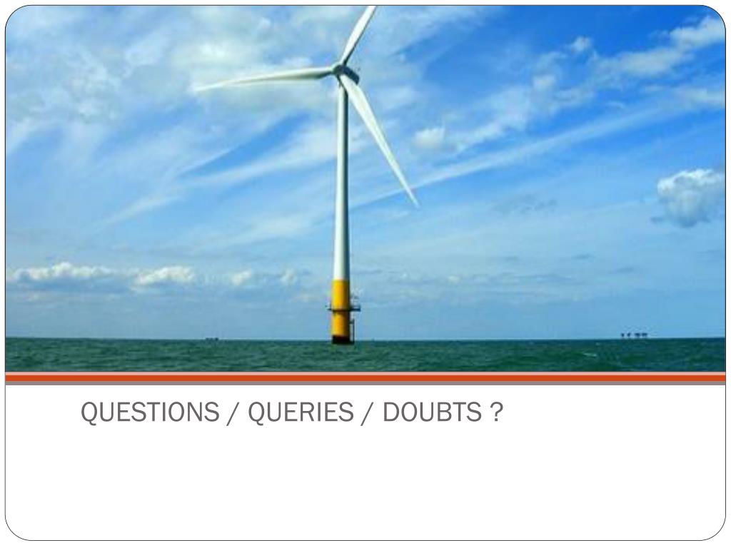 WORKING OF WIND POWER PLANT: • Wind turbines harness the wind's energy to generate electricity. Here, in short, is how they do it: • Wind makes BLADES turn. • Blades turn a shaft . • Gearbox connected to shaft increases ROTATIONAL speed. • Direct drive, Gearless technology • CONVERSION : Mechanical energy Electrical energy. • Power inverter • Transformer : output voltage of inverter / 11 KV – 33KV. • Local distribution / national greed.