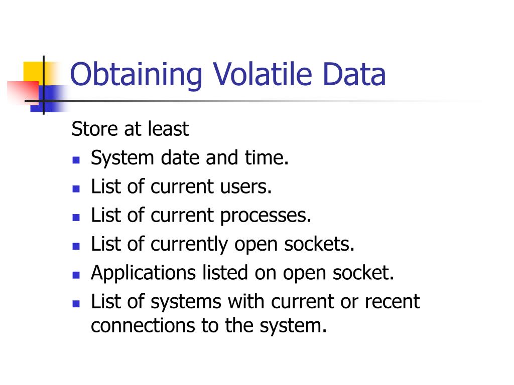 Obtaining Volatile Data Store at least • System date and time. • List of current users. • List of current processes. • List of currently open sockets. • Applications listed on open socket. • List of systems with current or recent connections to the system.