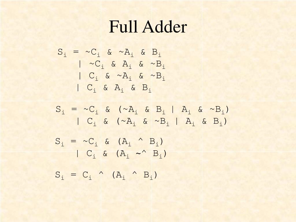 Full Adder Ci Ai Bi Si Ci+1 Si = ~Ci & ~Ai & Bi | ~Ci & Ai & ~Bi | Ci & ~Ai & ~Bi | Ci & Ai & Bi 0 0 0 0 0 0 0 1 1 0 0 1 0 1 0 0 1 1 0 1 1 0 0 1 0 1 0 1 0 1 1 1 0 0 1 1 1 1 1 1