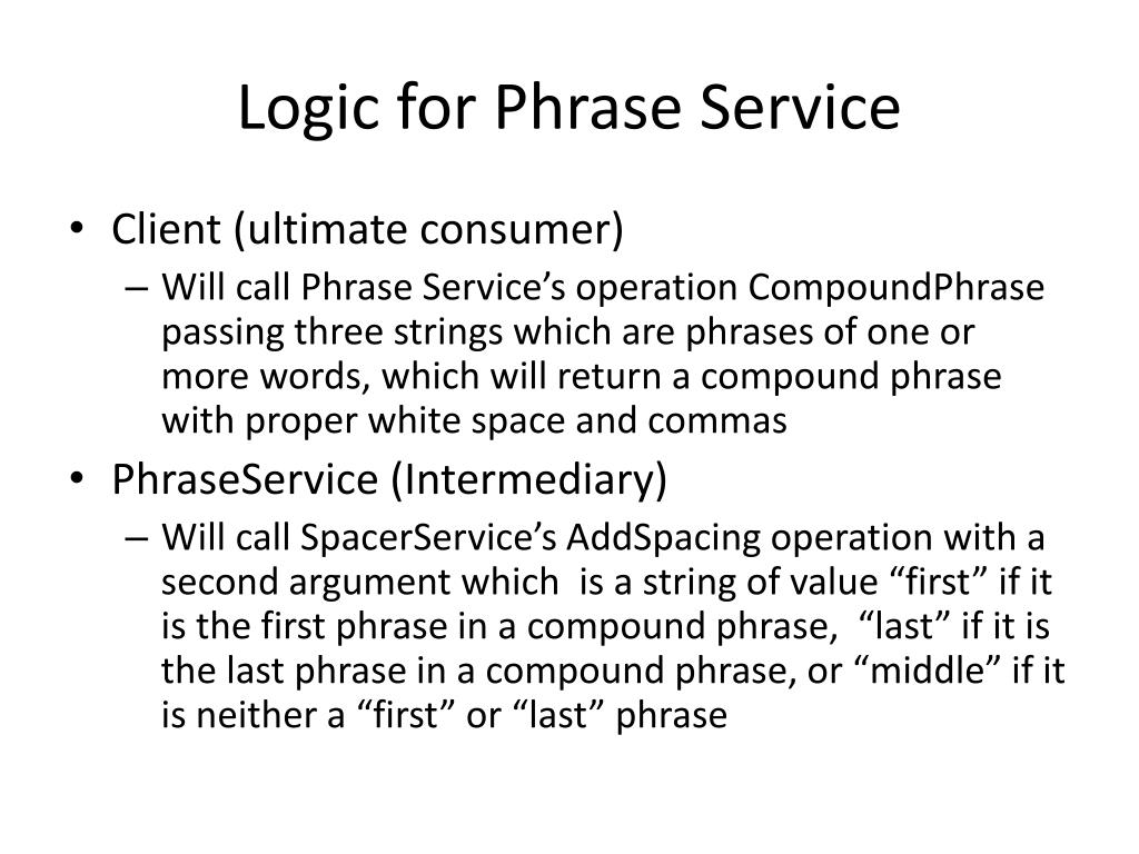 Logic for Phrase Service • Client (ultimate consumer) • Will call Phrase Service’s operation CompoundPhrase passing three strings which are phrases of one or more words, which will return a compound phrase with proper white space and commas • PhraseService (Intermediary) • Will call SpacerService’sAddSpacing operation with a second argument which is a string of value “first” if it is the first phrase in a compound phrase, “last” if it is the last phrase in a compoundphrase, or “middle” if it is neither a “first” or “last” phrase