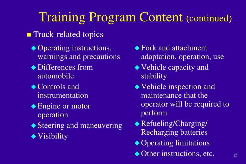 Training Program Content (continued) • The requirements of the OSHA standard on powered industrial trucks must also be included in the initial operator training program.