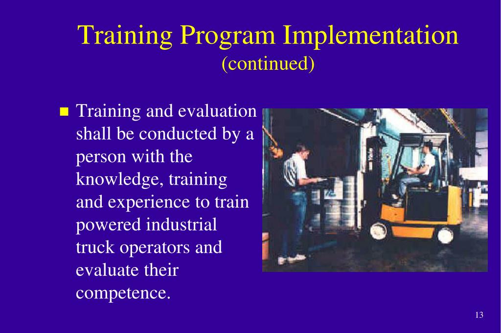 Training Program Implementation (continued) • Training and evaluation shall be conducted by a person with the knowledge, training and experience to train powered industrial truck operators and evaluate their competence.