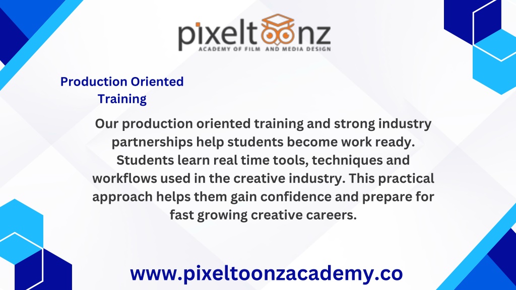 Production Oriented Training Our production oriented training and strong industry partnerships help students become work ready. Students learn real time tools, techniques and workflows used in the creative industry. This practical approach helps them gain confidence and prepare for fast growing creative careers. www.pixeltoonzacademy.com