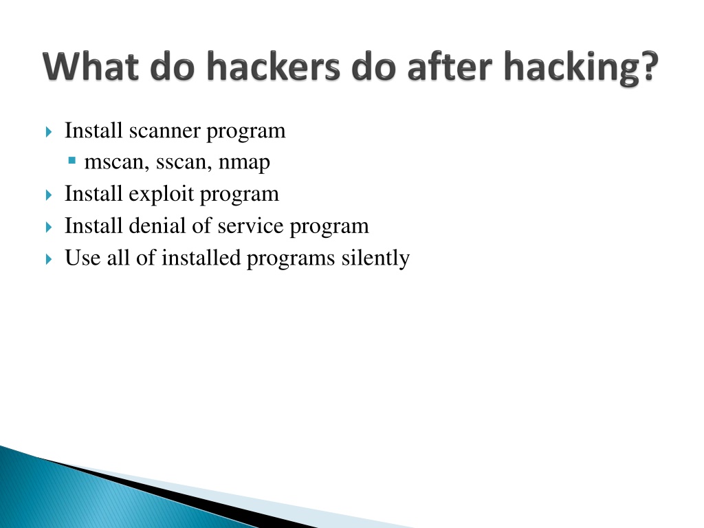 What do hackers do after hacking? • Install scanner program • mscan, sscan, nmap • Install exploit program • Install denial of service program • Use all of installed programs silently