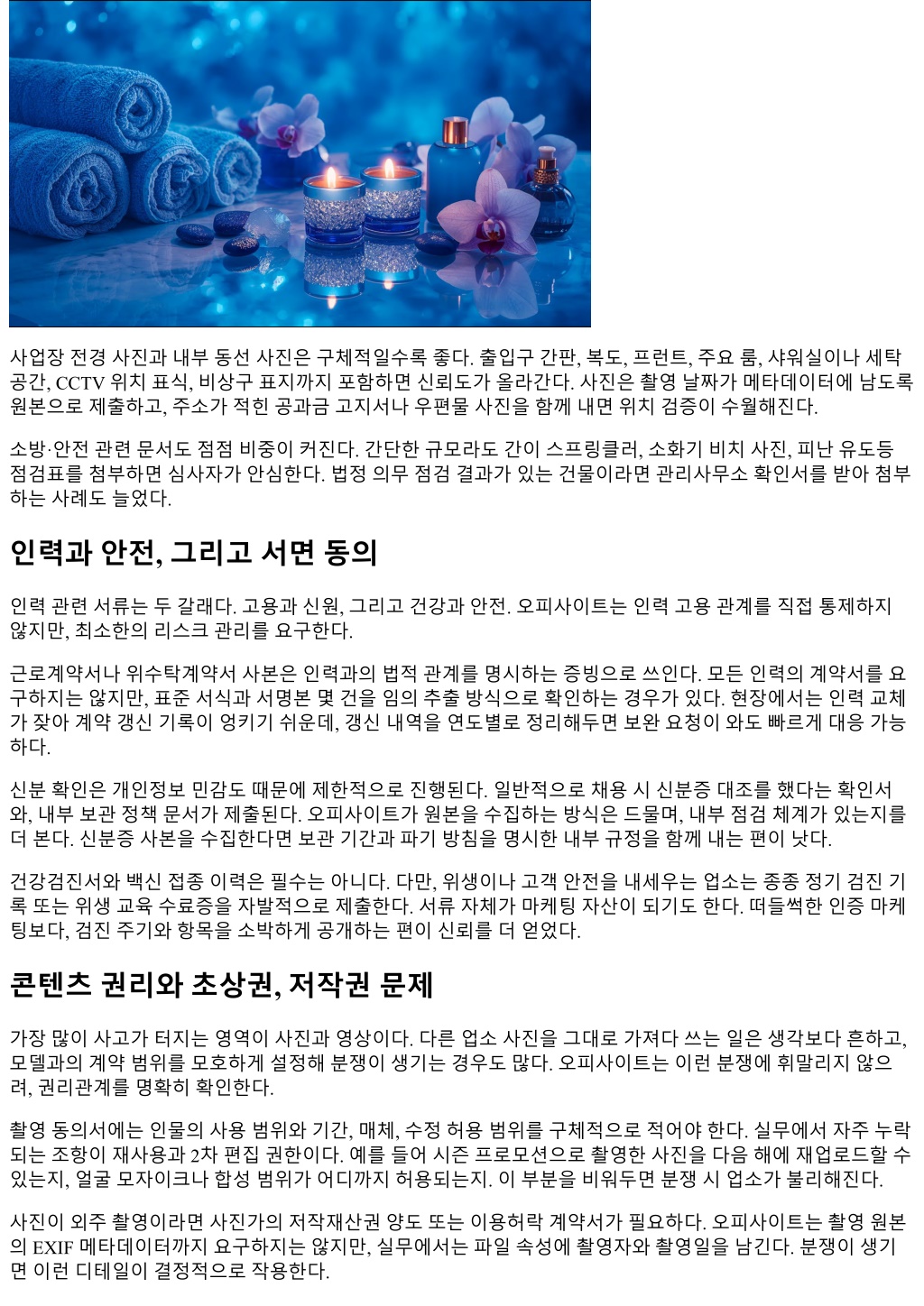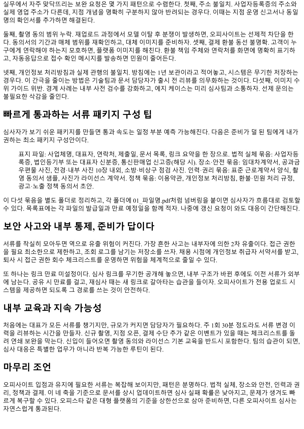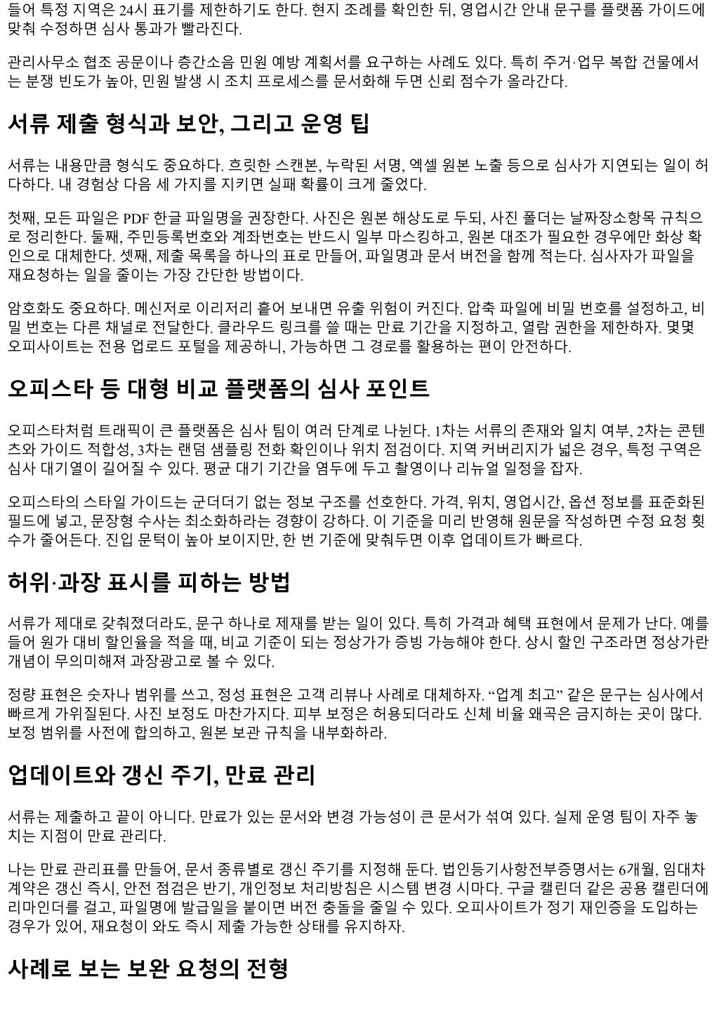 들어특정지역은 24시표기를제한하기도한다. 현지조례를확인한뒤, 영업시간안내문구를플랫폼가이드에 맞춰수정하면심사통과가빨라진다. 관리사무소협조공문이나층간소음민원예방계획서를요구하는사례도있다. 특히주거·업무복합건물에서 는분쟁빈도가높아, 민원발생시조치프로세스를문서화해두면신뢰점수가올라간다. 서류제출형식과보안, 그리고운영팁 서류는내용만큼형식도중요하다. 흐릿한스캔본, 누락된서명, 엑셀원본노출등으로심사가지연되는일이허 다하다. 내경험상다음세가지를지키면실패확률이크게줄었다. 첫째, 모든파일은 PDF 한글파일명을권장한다. 사진은원본해상도로두되, 사진폴더는날짜장소항목규칙으 로정리한다. 둘째, 주민등록번호와계좌번호는반드시일부마스킹하고, 원본대조가필요한경우에만화상확 인으로대체한다. 셋째, 제출목록을하나의표로만들어, 파일명과문서버전을함께적는다. 심사자가파일을 재요청하는일을줄이는가장간단한방법이다. 암호화도중요하다. 메신저로이리저리흩어보내면유출위험이커진다. 압축파일에비밀번호를설정하고, 비 밀번호는다른채널로전달한다. 클라우드링크를쓸때는만료기간을지정하고, 열람권한을제한하자. 몇몇 오피사이트는전용업로드포털을제공하니, 가능하면그경로를활용하는편이안전하다. 오피스타등대형비교플랫폼의심사포인트 오피스타처럼트래픽이큰플랫폼은심사팀이여러단계로나뉜다. 1차는서류의존재와일치여부, 2차는콘텐 츠와가이드적합성, 3차는랜덤샘플링전화확인이나위치점검이다. 지역커버리지가넓은경우, 특정구역은 심사대기열이길어질수있다. 평균대기기간을염두에두고촬영이나리뉴얼일정을잡자. 오피스타의스타일가이드는군더더기없는정보구조를선호한다. 가격, 위치, 영업시간, 옵션정보를표준화된 필드에넣고, 문장형수사는최소화하라는경향이강하다. 이기준을미리반영해원문을작성하면수정요청횟 수가줄어든다. 진입문턱이높아보이지만, 한번기준에맞춰두면이후업데이트가빠르다. 허위·과장표시를피하는방법 서류가제대로갖춰졌더라도, 문구하나로제재를받는일이있다. 특히가격과혜택표현에서문제가난다. 예를 들어원가대비할인율을적을때, 비교기준이되는정상가가증빙가능해야한다. 상시할인구조라면정상가란 개념이무의미해져과장광고로볼수있다. 정량표현은숫자나범위를쓰고, 정성표현은고객리뷰나사례로대체하자. “업계최고” 같은문구는심사에서 빠르게가위질된다. 사진보정도마찬가지다. 피부보정은허용되더라도신체비율왜곡은금지하는곳이많다. 보정범위를사전에합의하고, 원본보관규칙을내부화하라. 업데이트와갱신주기, 만료관리 서류는제출하고끝이아니다. 만료가있는문서와변경가능성이큰문서가섞여있다. 실제운영팀이자주놓 치는지점이만료관리다. 나는만료관리표를만들어, 문서종류별로갱신주기를지정해둔다. 법인등기사항전부증명서는 6개월, 임대차 계약은갱신즉시, 안전점검은반기, 개인정보처리방침은시스템변경시마다. 구글캘린더같은공용캘린더에 리마인더를걸고, 파일명에발급일을붙이면버전충돌을줄일수있다. 오피사이트가정기재인증을도입하는 경우가있어, 재요청이와도즉시제출가능한상태를유지하자. 사례로보는보완요청의전형