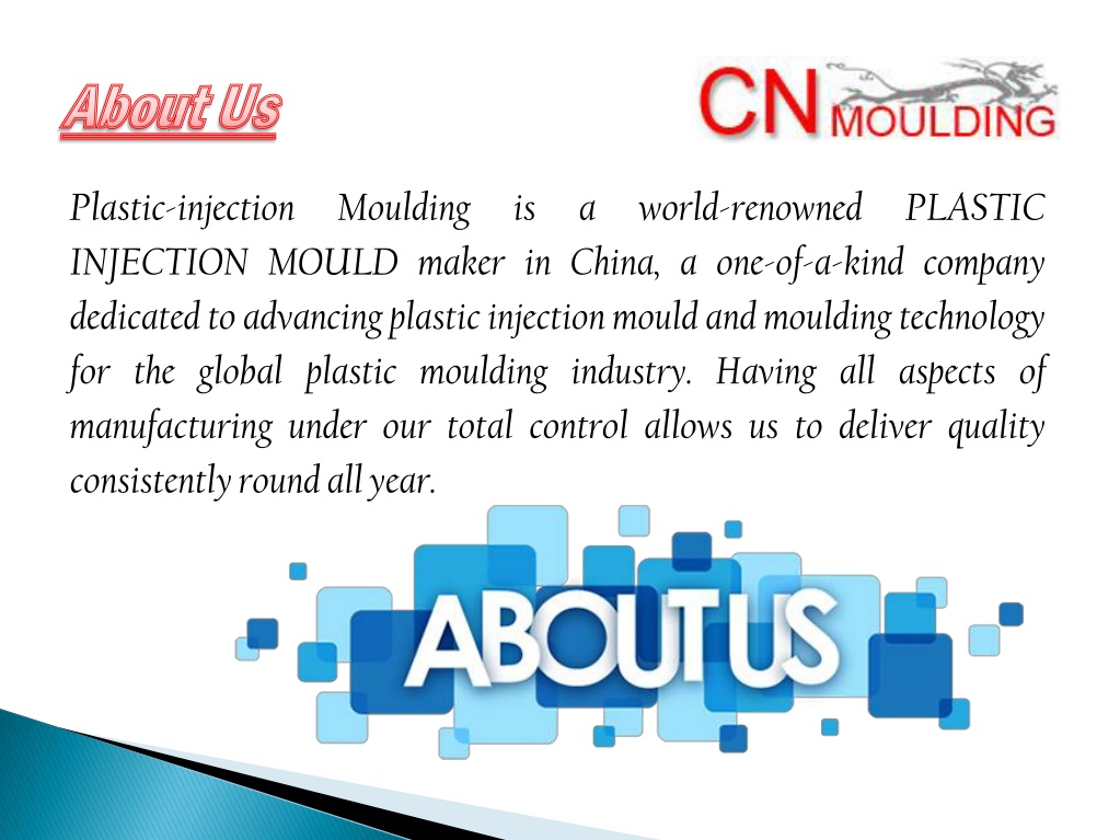 About Us Plastic-injection Moulding is a world-renowned PLASTIC INJECTION MOULD maker in China, a one-of-a-kind company dedicated to advancing plastic injection mould and moulding technology for the global plastic moulding industry. Having all aspects of manufacturing under our total control allows us to deliver quality consistently round all year.