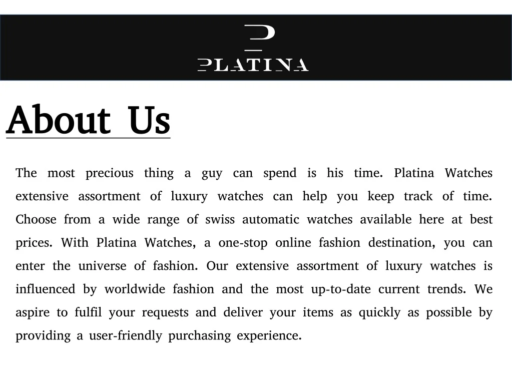 About Us The most precious thing a guy can spend is his time. Platina Watches extensive assortment of luxury watches can help you keep track of time. Choose from a wide range of swiss automatic watches available here at best prices. With Platina Watches, a one-stop online fashion destination, you can enter the universe of fashion. Our extensive assortment of luxury watches is influenced by worldwide fashion and the most up-to-date current trends. We aspire to fulfil your requests and deliver your items as quickly as possible by providing a user-friendly purchasing experience.
