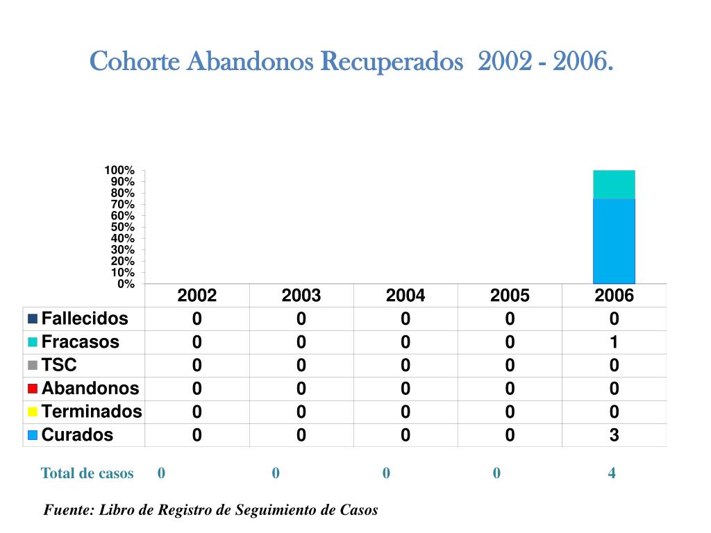 Cohorte Abandonos Recuperados 2002 - 2006. Total de casos 0 0 0 0 4 Fuente: Libro de Registro de Seguimiento de Casos