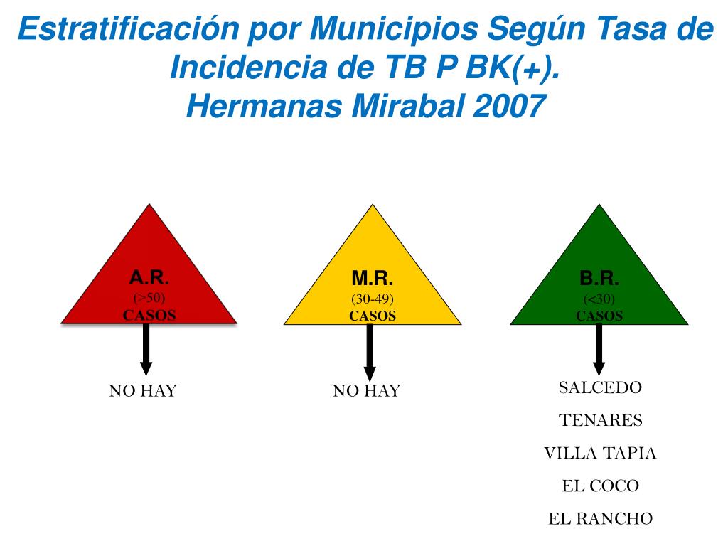 Estratificación por Municipios Según Tasa de Incidencia de TB P BK(+). Hermanas Mirabal 2007 A.R. (>50) CASOS M.R. (30-49) CASOS B.R. (<30) CASOS SALCEDO TENARES VILLA TAPIA EL COCO EL RANCHO NO HAY NO HAY