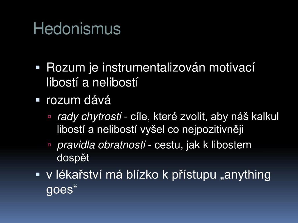 Hedonismus • Rozum je instrumentalizován motivací libostí a nelibostí • rozum dává • rady chytrosti - cíle, které zvolit, aby náš kalkul libostí a nelibostí vyšel co nejpozitivněji • pravidla obratnosti - cestu, jak k libostem dospět • v lékařství má blízko k přístupu „anything goes“