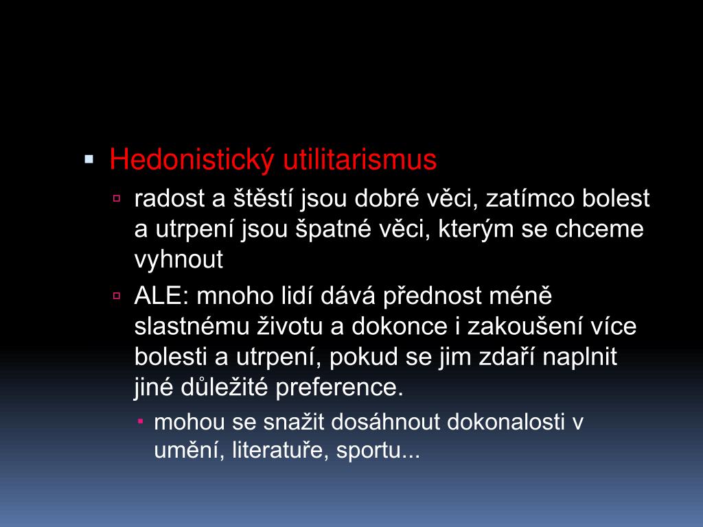 Hedonistický utilitarismus • radost a štěstí jsou dobré věci, zatímco bolest a utrpení jsou špatné věci, kterým se chceme vyhnout • ALE: mnoho lidí dává přednost méně slastnému životu a dokonce i zakoušení více bolesti a utrpení, pokud se jim zdaří naplnit jiné důležité preference. • mohou se snažit dosáhnout dokonalosti v umění, literatuře, sportu...