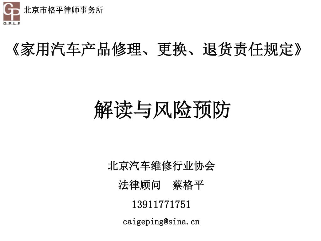 《家用汽车产品修理、更换、退货责任规定》 解读与风险预防 北京汽车维修行业协会 法律顾问 蔡格平 13911771751 caigeping@sina.cn