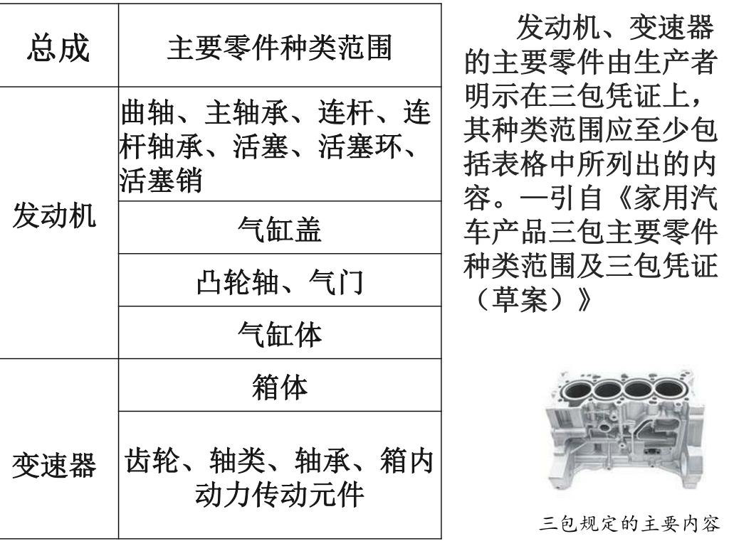 发动机、变速器的主要零件由生产者明示在三包凭证上,其种类范围应至少包括表格中所列出的内容。—引自《家用汽车产品三包主要零件种类范围及三包凭证(草案)》发动机、变速器的主要零件由生产者明示在三包凭证上,其种类范围应至少包括表格中所列出的内容。—引自《家用汽车产品三包主要零件种类范围及三包凭证(草案)》 三包规定的主要内容