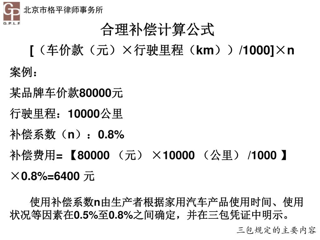 合理补偿计算公式 [(车价款(元)×行驶里程(km))/1000]×n 案例: 某品牌车价款80000元 行驶里程:10000公里 补偿系数(n):0.8% 补偿费用= 【80000 (元) ×10000 (公里) /1000 】 ×0.8%=6400 元 使用补偿系数n由生产者根据家用汽车产品使用时间、使用状况等因素在0.5%至0.8%之间确定,并在三包凭证中明示。 三包规定的主要内容