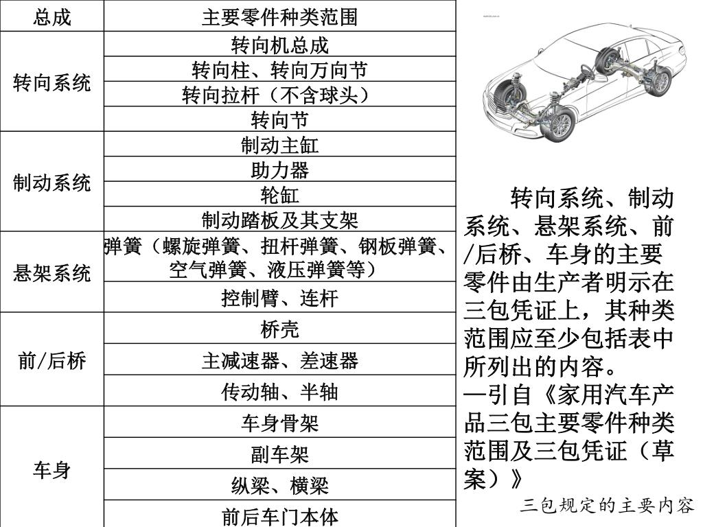 转向系统、制动系统、悬架系统、前/后桥、车身的主要零件由生产者明示在三包凭证上,其种类范围应至少包括表中所列出的内容。转向系统、制动系统、悬架系统、前/后桥、车身的主要零件由生产者明示在三包凭证上,其种类范围应至少包括表中所列出的内容。 —引自《家用汽车产品三包主要零件种类范围及三包凭证(草案)》 三包规定的主要内容