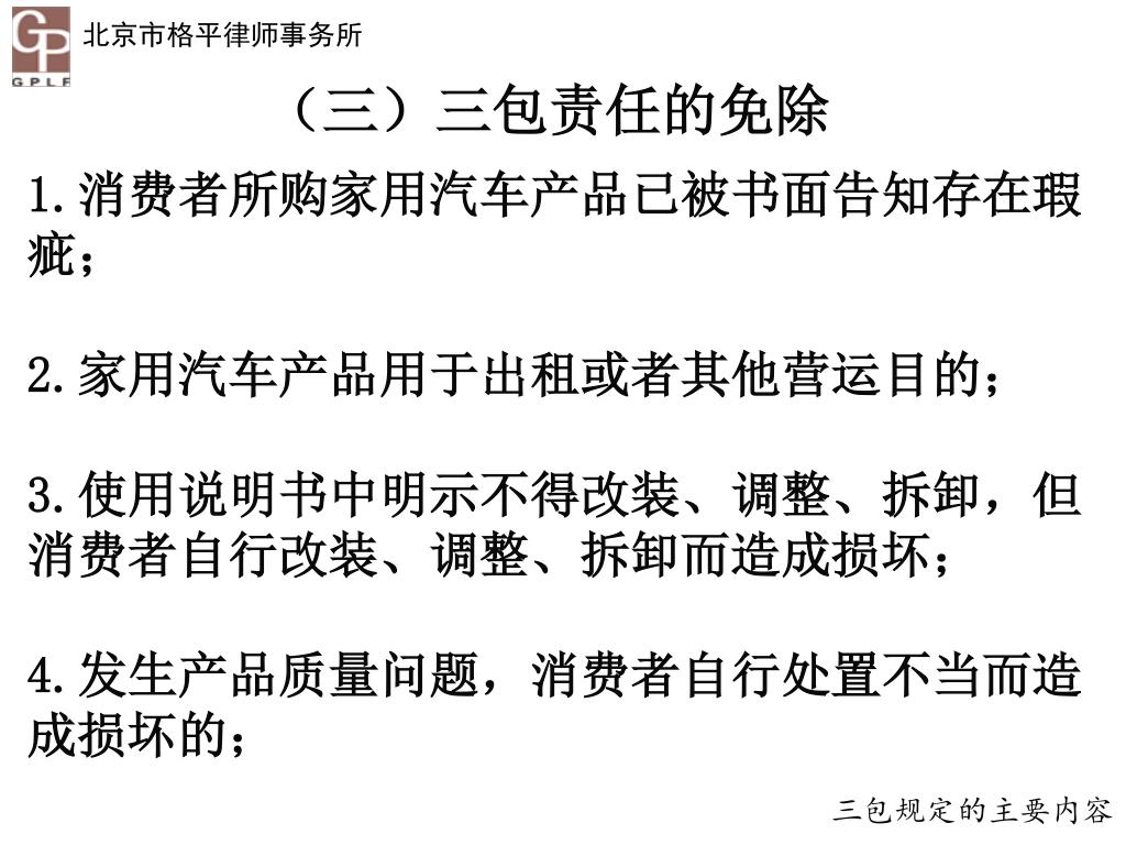 (三)三包责任的免除 1.消费者所购家用汽车产品已被书面告知存在瑕疵; 2.家用汽车产品用于出租或者其他营运目的; 3.使用说明书中明示不得改装、调整、拆卸,但消费者自行改装、调整、拆卸而造成损坏; 4.发生产品质量问题,消费者自行处置不当而造成损坏的; 三包规定的主要内容