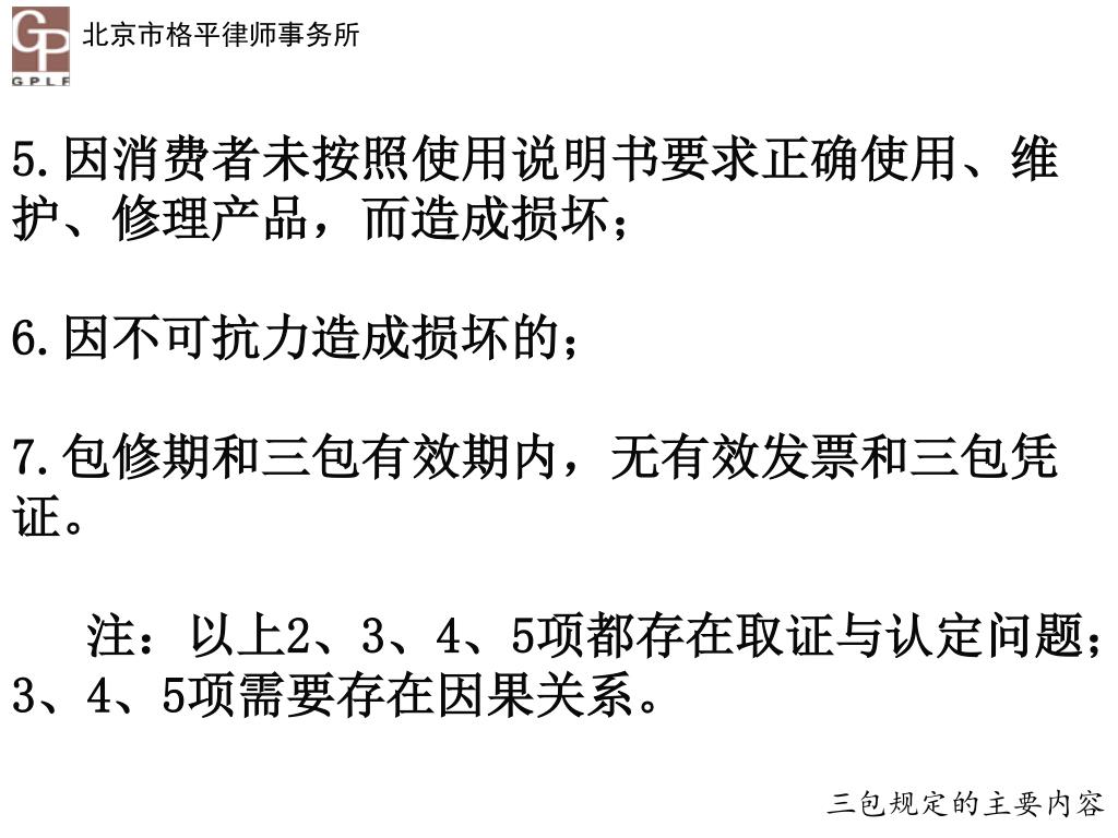 5.因消费者未按照使用说明书要求正确使用、维护、修理产品,而造成损坏;5.因消费者未按照使用说明书要求正确使用、维护、修理产品,而造成损坏; 6.因不可抗力造成损坏的; 7.包修期和三包有效期内,无有效发票和三包凭证。 注:以上2、3、4、5项都存在取证与认定问题;3、4、5项需要存在因果关系。 三包规定的主要内容