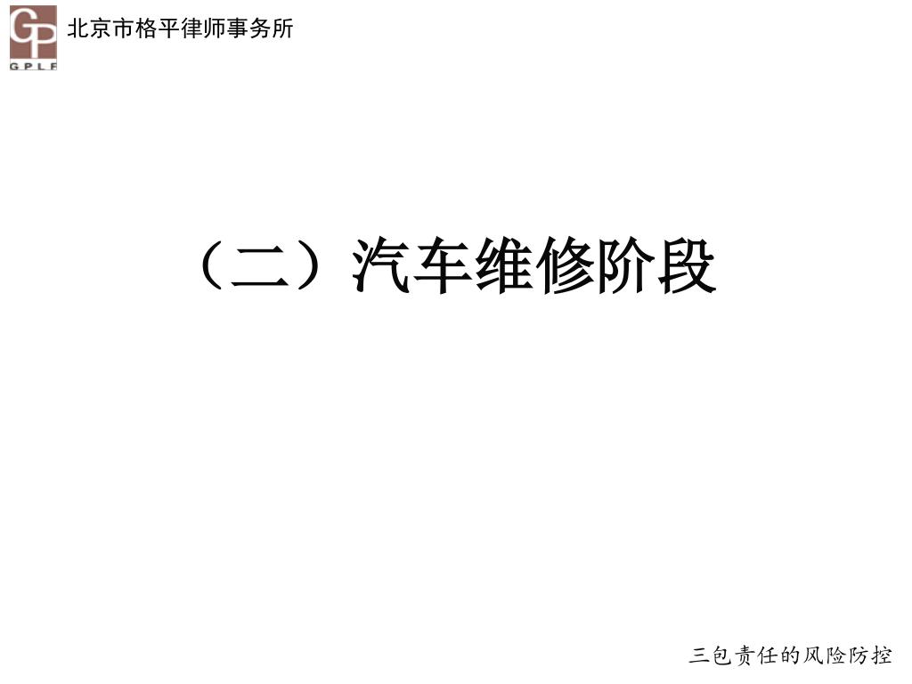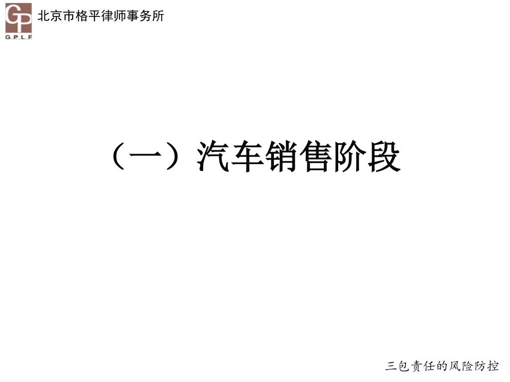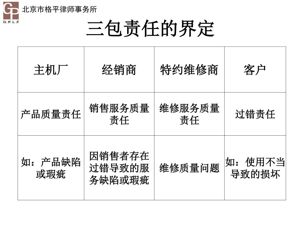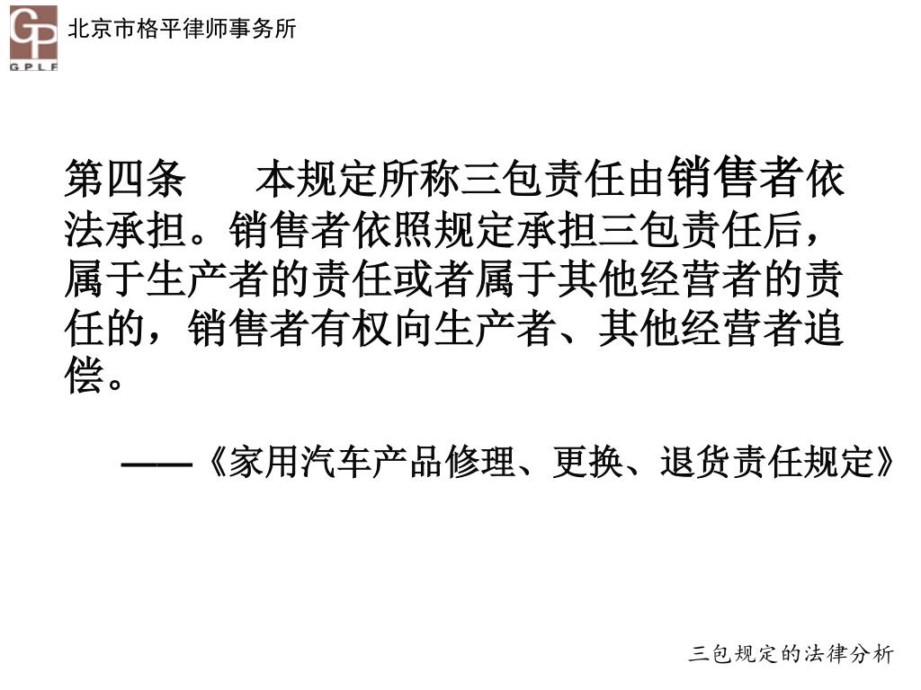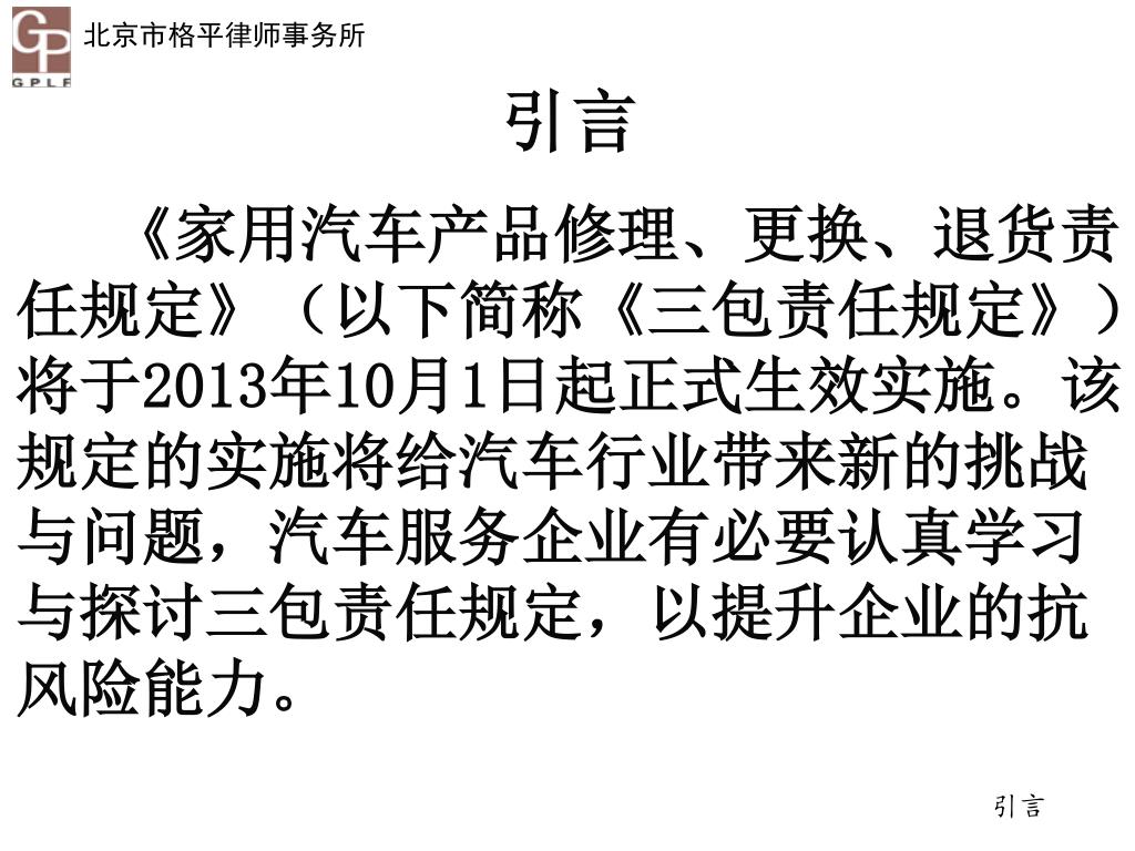 《家用汽车产品修理、更换、退货责任规定 》 解读与风险预防 北京汽车维修行业协会 法律顾问 蔡格平 13911771751 caigeping@sina.cn. 引言 《家用汽车产品修理、更换、退货责任规定 》 (以下简称《三包责任规定》)将于2013年10月1日起正式生效实施。该规定的实施将给汽车行业带来新的挑战与问题,汽车服务企业有必要认真学习与探讨三包责任规定,以提升企业的抗风险能力。. 引言. 目录. 一、三包规定的主要内容 二、三包规定的法律分析 三、三包责任的风险防控 四、三包纠纷的处理
