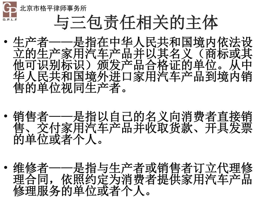与三包责任相关的主体 生产者——是指在中华人民共和国境内依法设立的生产家用汽车产品并以其名义(商标或其他可识别标识)颁发产品合格证的单位。从中华人民共和国境外进口家用汽车产品到境内销售的单位视同生产者。 销售者——是指以自己的名义向消费者直接销售、交付家用汽车产品并收取货款、开具发票的单位或者个人。 维修者——是指与生产者或销售者订立代理修理合同,依照约定为消费者提供家用汽车产品修理服务的单位或者个人。