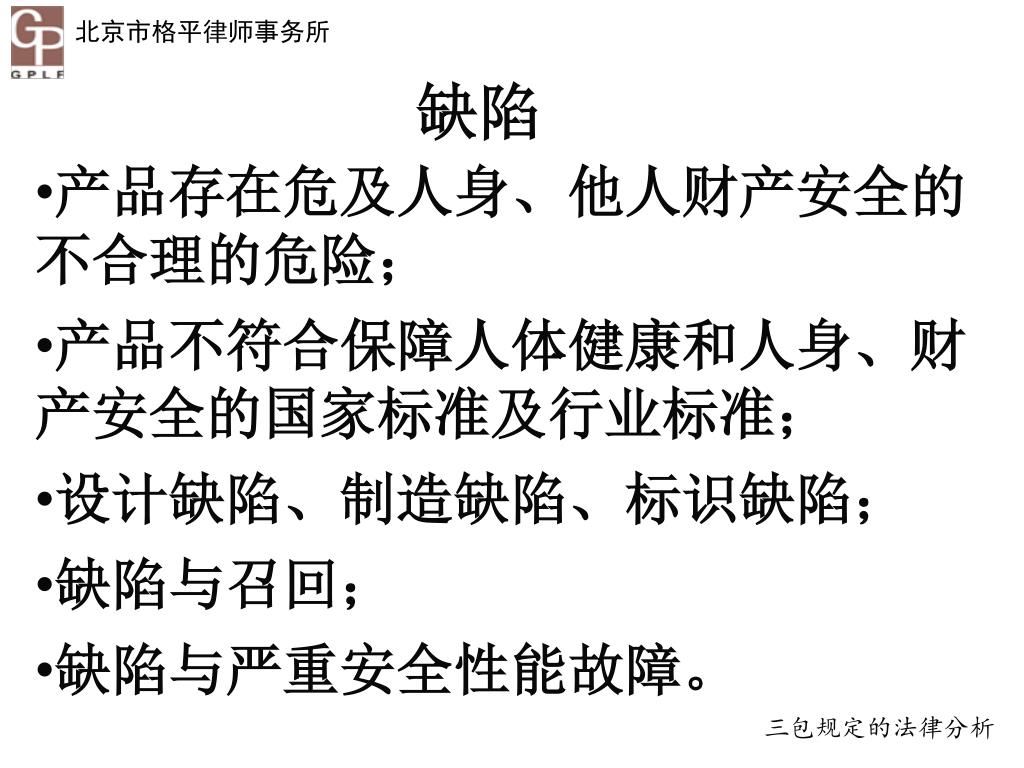 缺陷 • 产品存在危及人身、他人财产安全的不合理的危险; • 产品不符合保障人体健康和人身、财产安全的国家标准及行业标准; • 设计缺陷、制造缺陷、标识缺陷; • 缺陷与召回; • 缺陷与严重安全性能故障。 三包规定的法律分析
