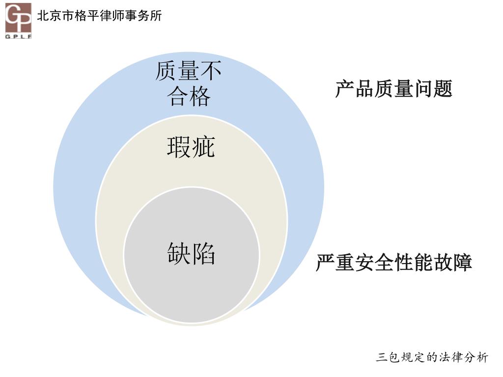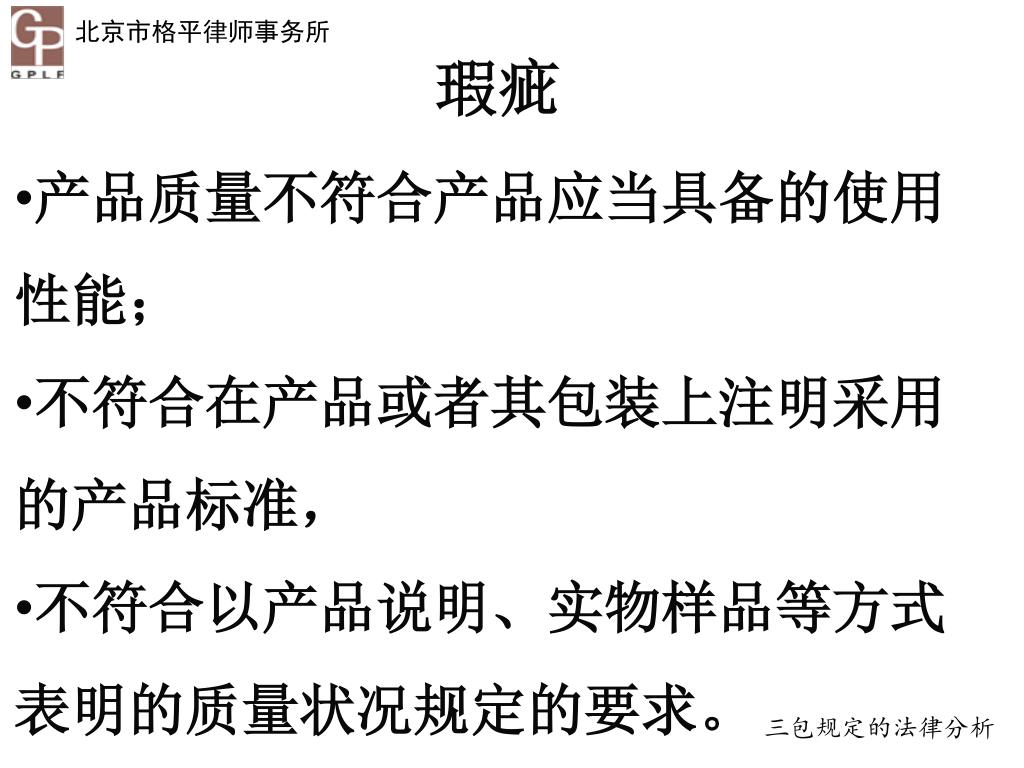 瑕疵 • 产品质量不符合产品应当具备的使用性能; • 不符合在产品或者其包装上注明采用的产品标准, • 不符合以产品说明、实物样品等方式表明的质量状况规定的要求。 三包规定的法律分析