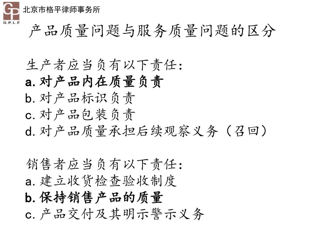 产品质量问题与服务质量问题的区分 生产者应当负有以下责任: a.对产品内在质量负责 b.对产品标识负责 c.对产品包装负责 d.对产品质量承担后续观察义务(召回) 销售者应当负有以下责任: a.建立收货检查验收制度 b.保持销售产品的质量 c.产品交付及其明示警示义务