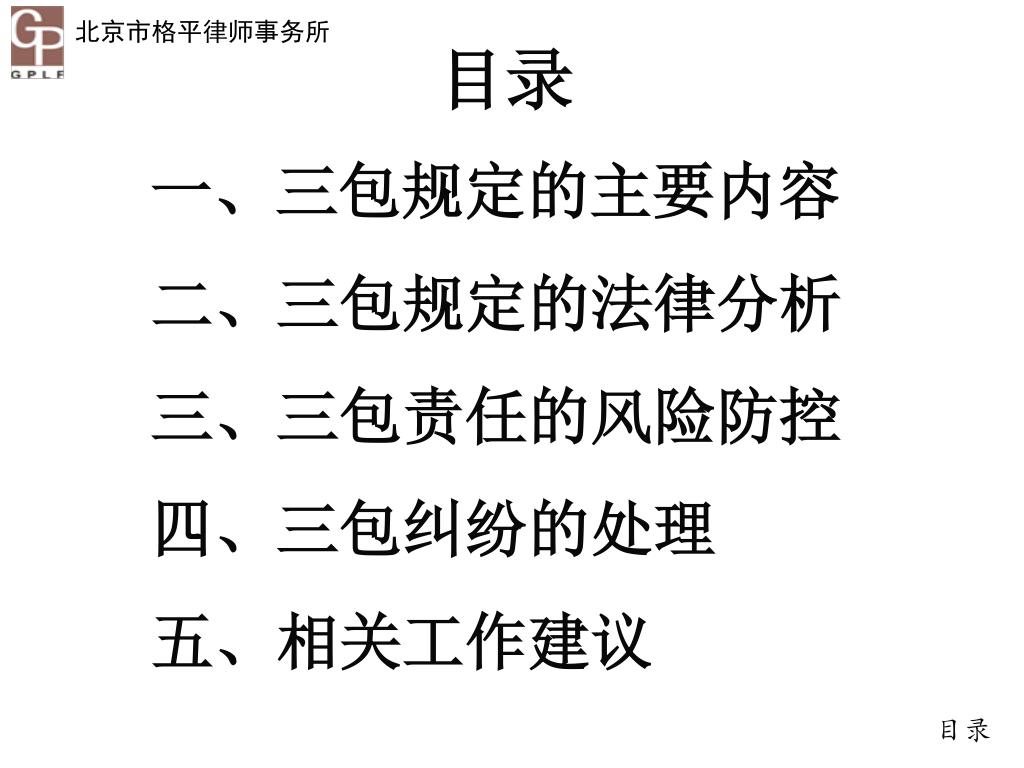 目录 一、三包规定的主要内容 二、三包规定的法律分析 三、三包责任的风险防控 四、三包纠纷的处理 五、相关工作建议 目录
