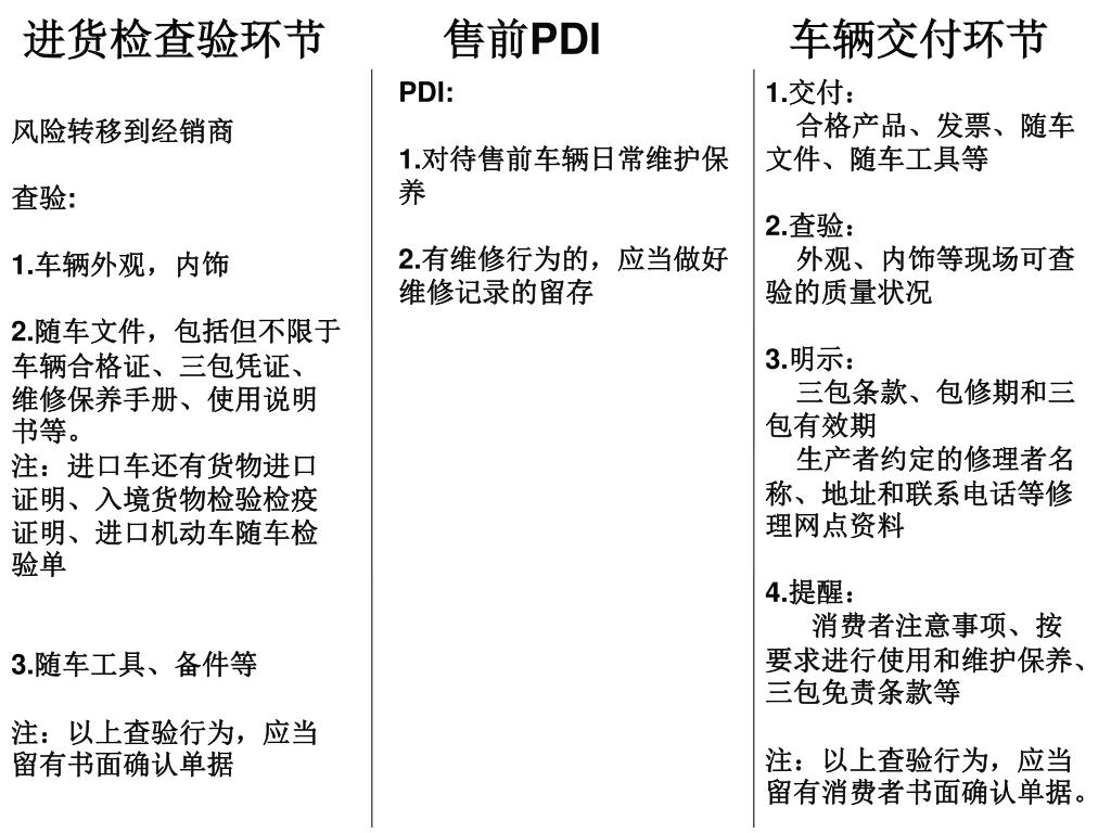 售前PDI 车辆交付环节 进货检查验环节 PDI: 1.对待售前车辆日常维护保养 2.有维修行为的,应当做好维修记录的留存 1.交付: 合格产品、发票、随车文件、随车工具等 2.查验: 外观、内饰等现场可查验的质量状况 3.明示: 三包条款、包修期和三包有效期 生产者约定的修理者名称、地址和联系电话等修理网点资料 4.提醒: 消费者注意事项、按要求进行使用和维护保养、三包免责条款等 注:以上查验行为,应当留有消费者书面确认单据。 风险转移到经销商 查验: 1.车辆外观,内饰 2.随车文件,包括但不限于车辆合格证、三包凭证、维修保养手册、使用说明书等。 注:进口车还有货物进口证明、入境货物检验检疫证明、进口机动车随车检验单 3.随车工具、备件等 注:以上查验行为,应当留有书面确认单据