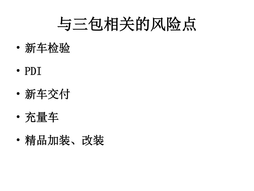 与三包相关的风险点 • 新车检验 • PDI • 新车交付 • 充量车 • 精品加装、改装