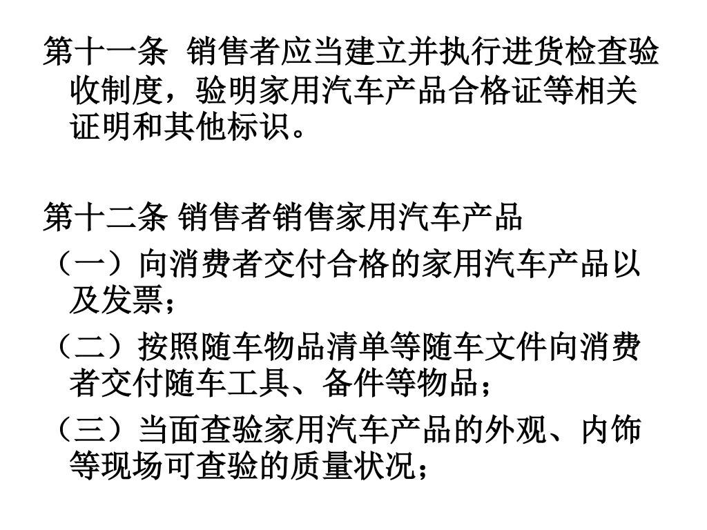 第十一条销售者应当建立并执行进货检查验收制度,验明家用汽车产品合格证等相关证明和其他标识。第十一条销售者应当建立并执行进货检查验收制度,验明家用汽车产品合格证等相关证明和其他标识。 第十二条 销售者销售家用汽车产品 (一)向消费者交付合格的家用汽车产品以及发票; (二)按照随车物品清单等随车文件向消费者交付随车工具、备件等物品; (三)当面查验家用汽车产品的外观、内饰等现场可查验的质量状况;