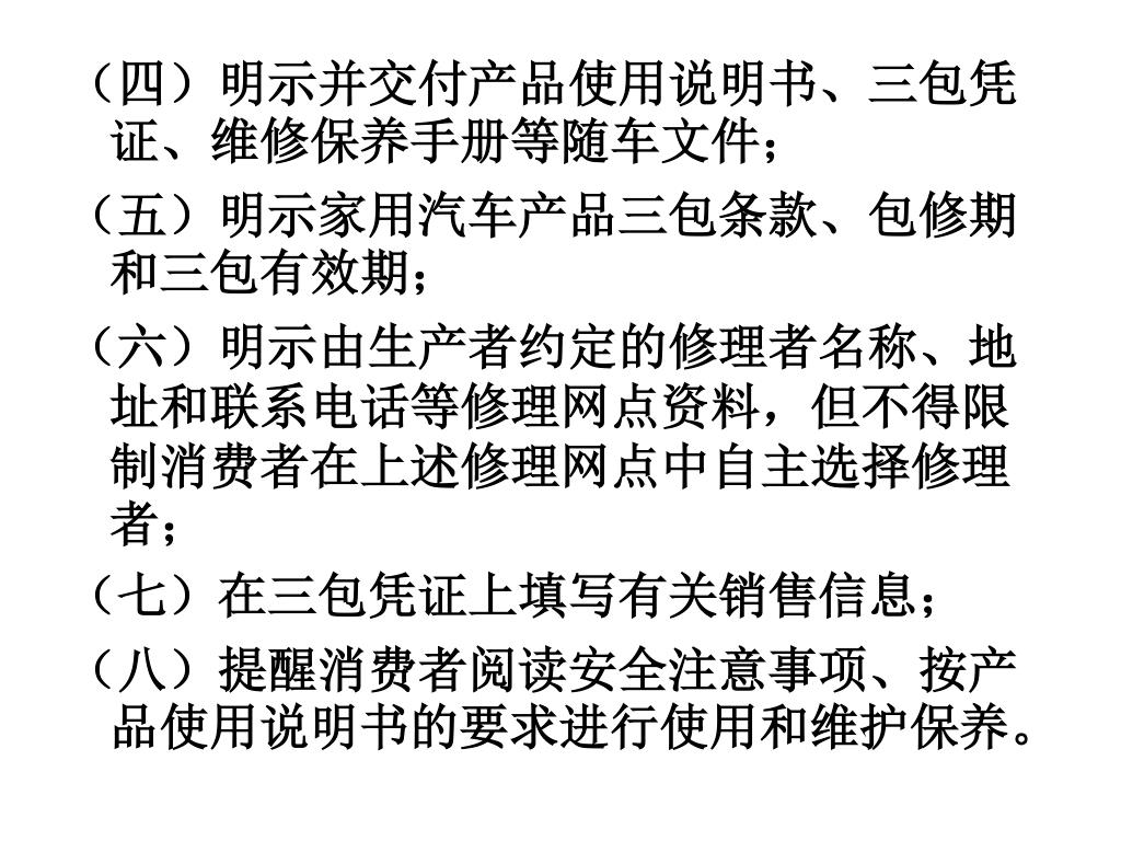 (四)明示并交付产品使用说明书、三包凭证、维修保养手册等随车文件;(四)明示并交付产品使用说明书、三包凭证、维修保养手册等随车文件; (五)明示家用汽车产品三包条款、包修期和三包有效期; (六)明示由生产者约定的修理者名称、地址和联系电话等修理网点资料,但不得限制消费者在上述修理网点中自主选择修理者; (七)在三包凭证上填写有关销售信息; (八)提醒消费者阅读安全注意事项、按产品使用说明书的要求进行使用和维护保养。