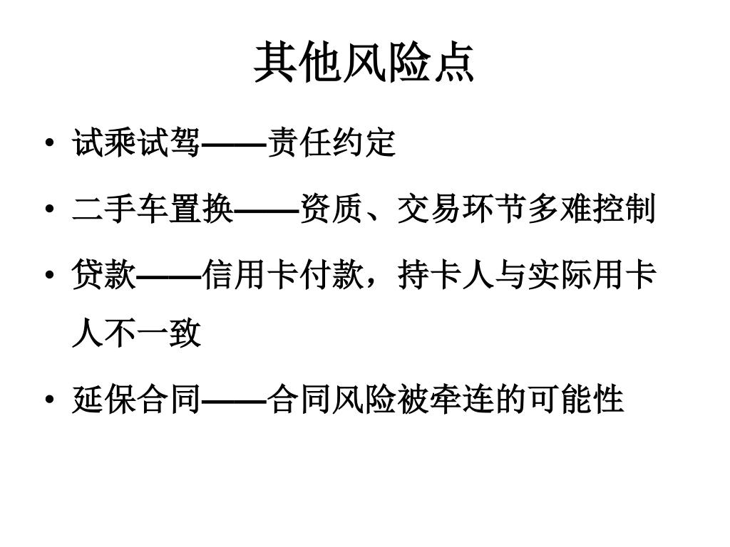 其他风险点 • 试乘试驾——责任约定 • 二手车置换——资质、交易环节多难控制 • 贷款——信用卡付款,持卡人与实际用卡人不一致 • 延保合同——合同风险被牵连的可能性