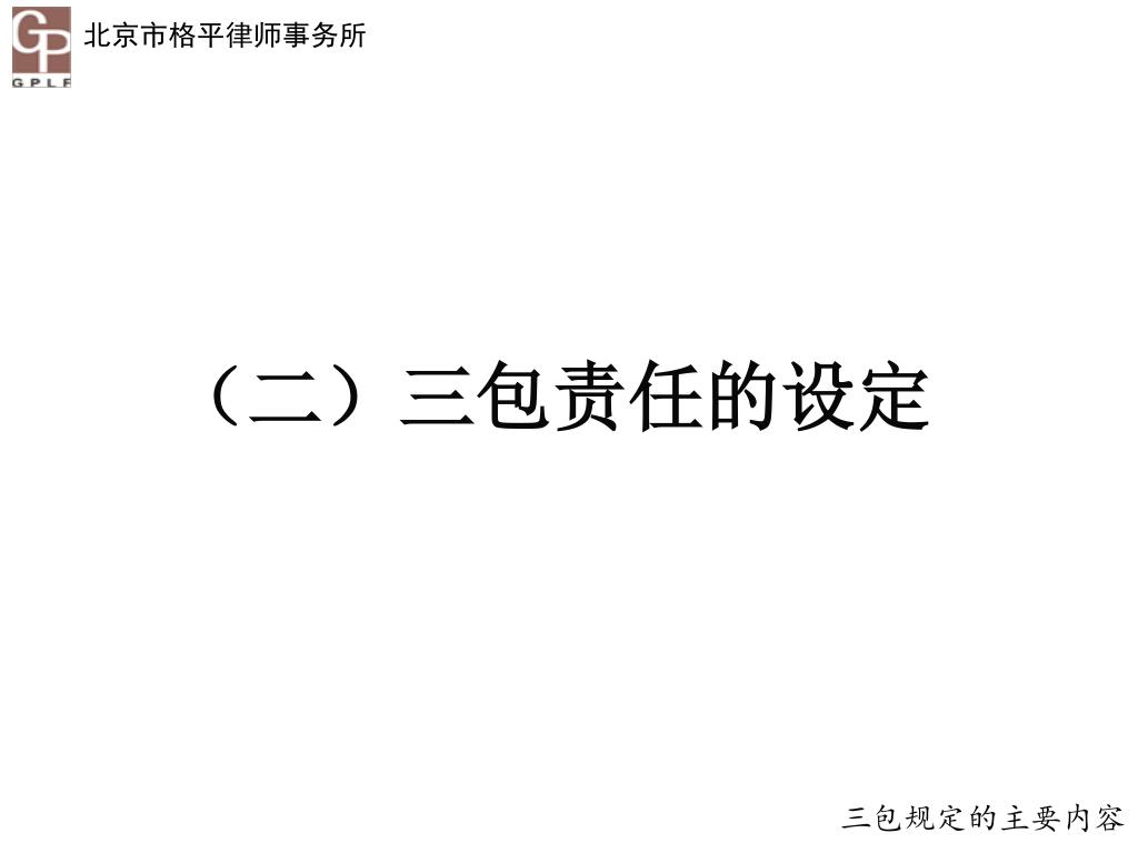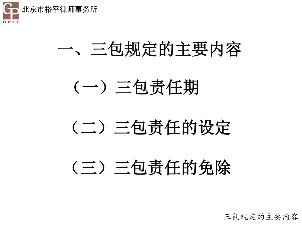 一、三包规定的主要内容 (一)三包责任期 (二)三包责任的设定 (三)三包责任的免除 三包规定的主要内容