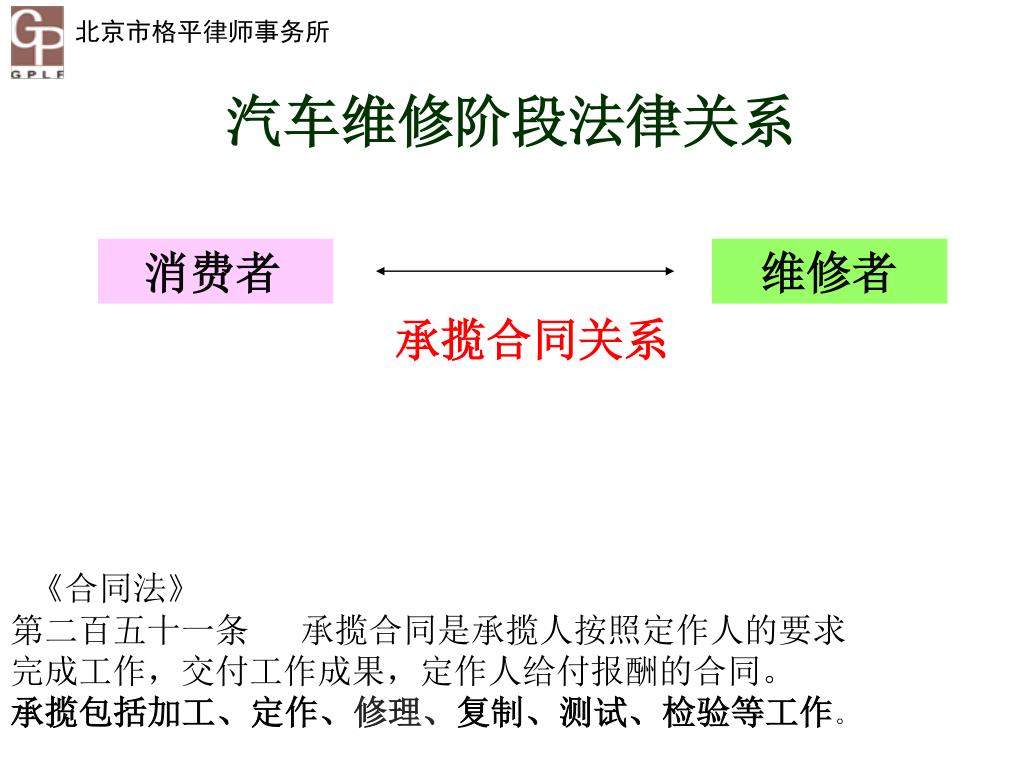 汽车维修阶段法律关系 消费者 维修者 承揽合同关系 《合同法》 第二百五十一条 承揽合同是承揽人按照定作人的要求 完成工作,交付工作成果,定作人给付报酬的合同。承揽包括加工、定作、修理、复制、测试、检验等工作。
