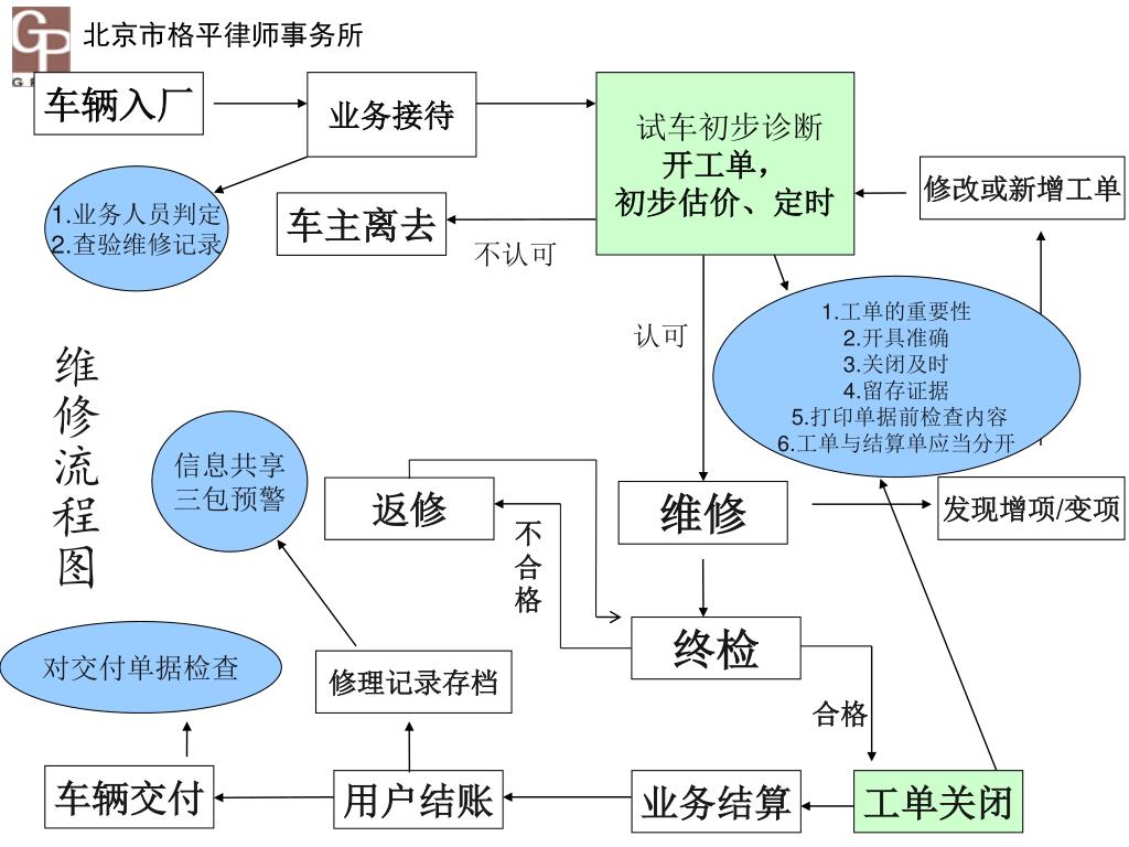 车辆入厂 业务接待 试车初步诊断 开工单, 初步估价、定时 修改或新增工单 1.业务人员判定 2.查验维修记录 车主离去 不认可 1.工单的重要性 2.开具准确 3.关闭及时 4.留存证据 5.打印单据前检查内容 6.工单与结算单应当分开 认可 维修流程图 信息共享 三包预警 发现增项/变项 返修 维修 不合格 终检 对交付单据检查 修理记录存档 合格 车辆交付 用户结账 业务结算 工单关闭