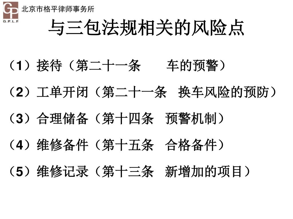 与三包法规相关的风险点 (1)接待(第二十一条车的预警) (2)工单开闭(第二十一条换车风险的预防) (3)合理储备(第十四条预警机制) (4)维修备件(第十五条合格备件) (5)维修记录(第十三条新增加的项目)