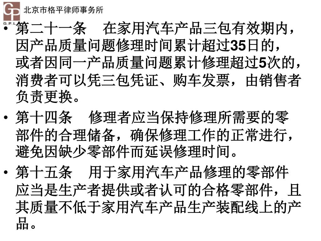 第二十一条 在家用汽车产品三包有效期内,因产品质量问题修理时间累计超过35日的,或者因同一产品质量问题累计修理超过5次的,消费者可以凭三包凭证、购车发票,由销售者负责更换。 • 第十四条 修理者应当保持修理所需要的零部件的合理储备,确保修理工作的正常进行,避免因缺少零部件而延误修理时间。 • 第十五条 用于家用汽车产品修理的零部件应当是生产者提供或者认可的合格零部件,且其质量不低于家用汽车产品生产装配线上的产品。