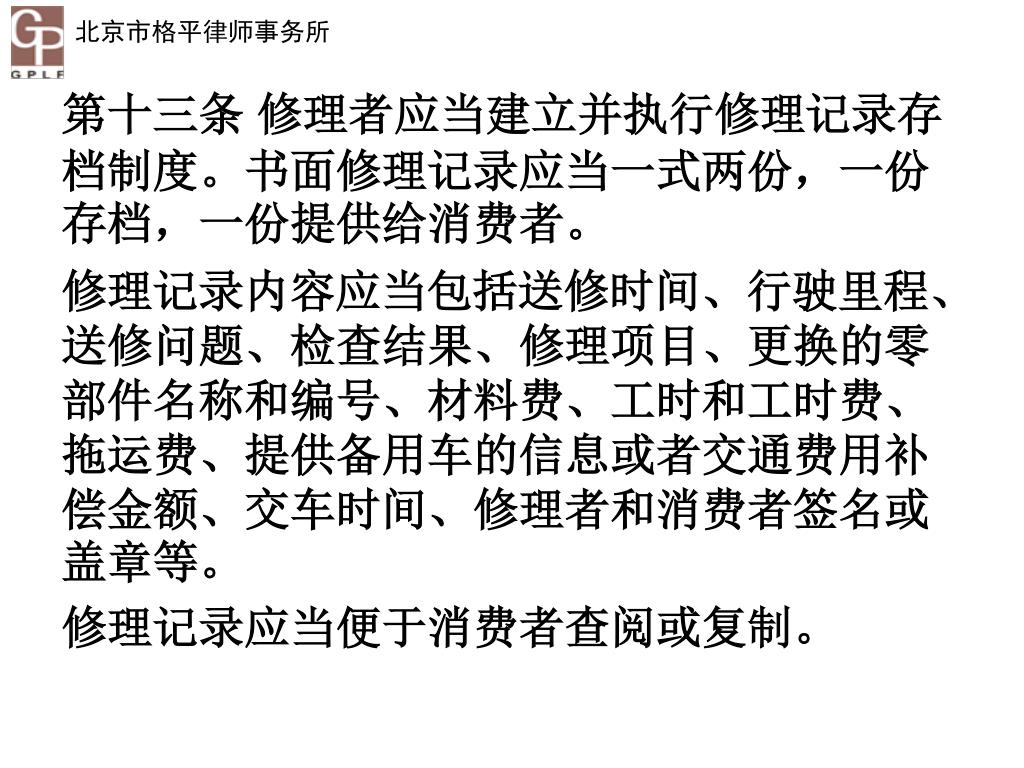 第十三条 修理者应当建立并执行修理记录存档制度。书面修理记录应当一式两份,一份存档,一份提供给消费者。 修理记录内容应当包括送修时间、行驶里程、送修问题、检查结果、修理项目、更换的零部件名称和编号、材料费、工时和工时费、拖运费、提供备用车的信息或者交通费用补偿金额、交车时间、修理者和消费者签名或盖章等。 修理记录应当便于消费者查阅或复制。
